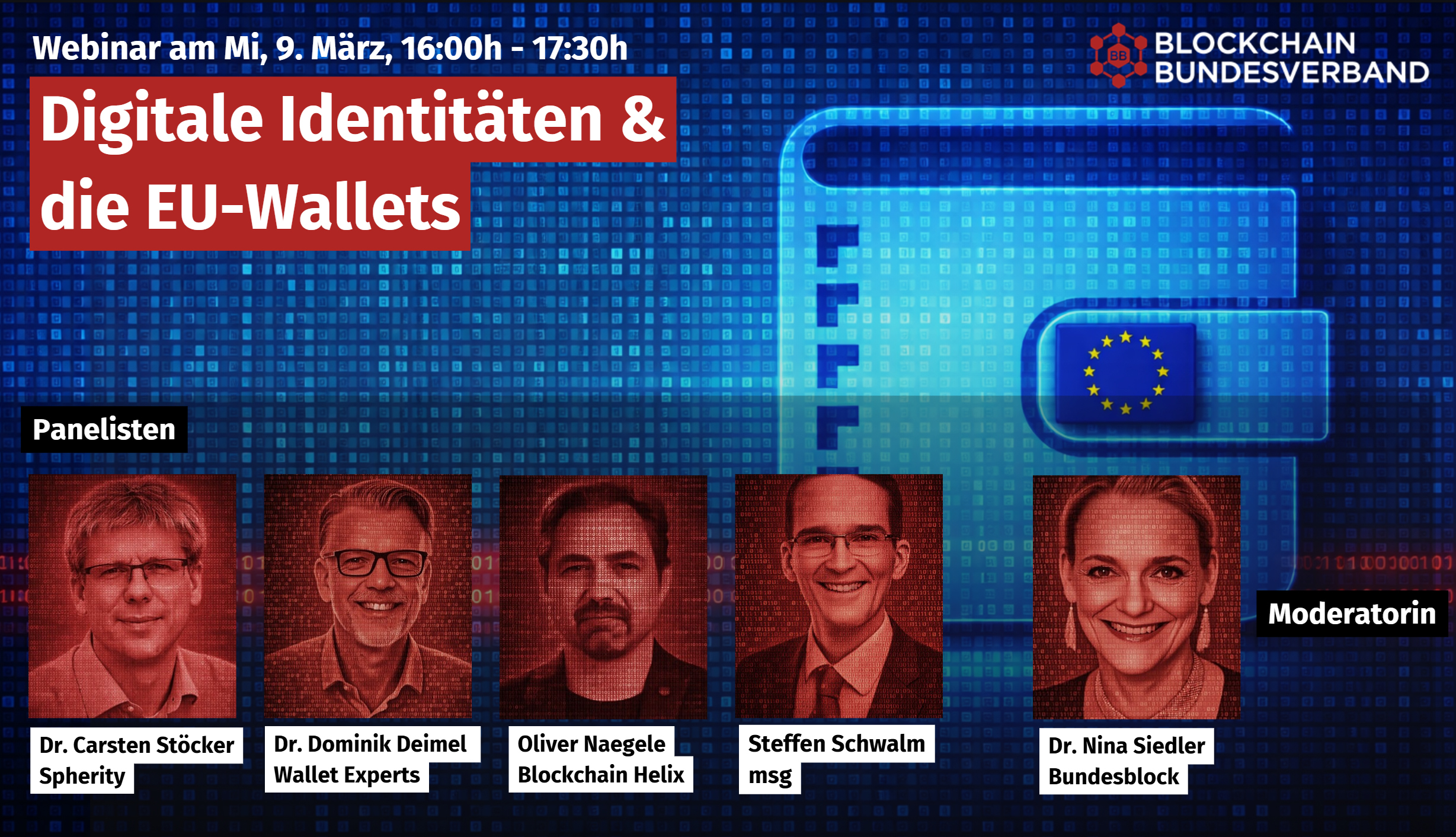 Der Blockchain Bundesverband e.V. lädt deswegen herzlich zu einem Webinar ein, das die Hintergründe, aktuellen Entwicklungen und praktischen Implikationen der EU Wallets beleuchtet. Wir wollen einen aktuellen Überblick über dieses wichtige Infrastruktur-Thema geben und diskutieren, welche Chancen sich für Unternehmen, Verwaltung und Bürger:innen ergeben – und welche technologischen sowie regulatorischen Herausforderungen zu beachten sind.